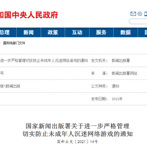 2021年9月1日起,《国家新闻出版署关于防止未成年人沉迷网络游戏工作的通知》正式施行,其中规定:“所有网络游戏企业仅可在周五、周六、周日和法定节假日每日20时至21时向未成年人提供1小时网络游戏服务,其他时间均不得以任何形式向未成年人提供网络游戏服务。”
