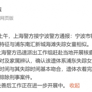 10月18日上午,上海警方接宁波警方通报:宁波市镇海区某滩涂发现一具女童遗体,衣着等特征与浦东南汇新城海滩失踪女童相似。